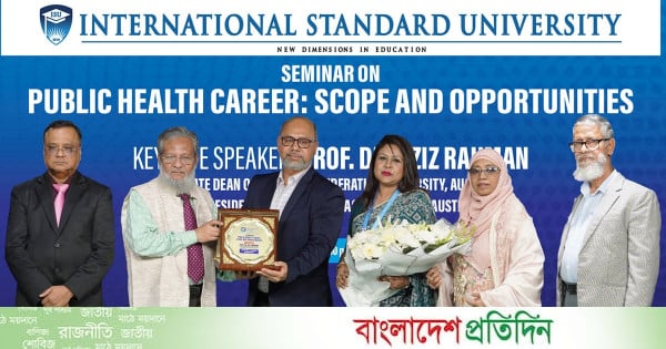 ইন্টারন্যাশনাল স্ট্যান্ডার্ড ইউনিভার্সিটির (আইএসইউ) মহাখালী ক্যাম্পাসে মাস্টার অব পাবলিক হেলথ (এমপিএইচ) প্রোগ্রামের উদ্যোগে বৃহস্পতিবার বিকেলে অনুষ্ঠিত হয়েছে 'জনস্বাস্থ্য পেশার সুযোগ ও সম্ভাবনা' শীর্ষক সেমিনার।