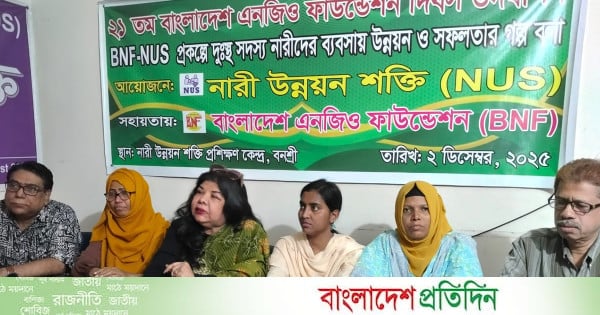 বাংলাদেশ এনজিও ফাউন্ডেশনের ২১তম বর্ষপূর্তি উদযাপন উপলক্ষে নারী উন্নয়ন শক্তি ‘দুঃস্থ নারী সদস্যদের উন্নয়ন ও সফলতার গল্প বলা’ শিরোনামে এক আলোচনা সভার আয়োজন করেছে। মঙ্গলবার সংস্থার বনশ্রী প্রশিক্ষণ কেন্দ্রে এ আলোচনা সভা অনুষ্ঠিত হয়।