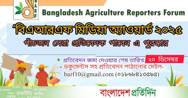 সিদ্ধান্ত অনুযায়ী এবার পাঁচজনকে ‘বিএআরএফ মিডিয়া অ্যাওয়ার্ড -২০২৫’ প্রদান করা হবে। এ লক্ষ্যে বাংলাদেশ থেকে প্রকাশিত জাতীয় ও স্থানীয় পত্রিকা, অনলাইন নিউজ পোর্টাল এবং টেলিভিশনে কর্মরত সাংবাদিকদের কাছ থেকে কৃষি বিষয়ক প্রতিবেদন আহ্বান করা হয়েছে।