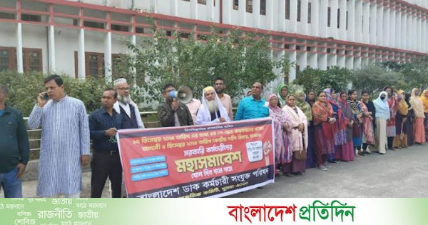 বুধবার (৩ ডিসেম্বর) খুলনা পিএমজি অফিস চত্বরে অনুষ্ঠিত মানববন্ধনে সভাপতিত্ব করেন সংগঠনের আঞ্চলিক আহ্বায়ক মো. শহিদুল্লাহ। মানববন্ধনে বক্তব্য রাখেন ডাক জীবন বীমা অফিসের মোস্তাফিজুর রহমান, ইউসুফ আলী মোল্লা এবং খুলনা জিপিও’র মোহাম্মদ রওশন আলী মিন্টু।