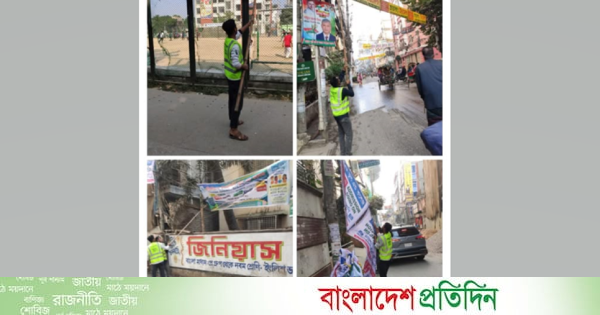 ঢাকা উত্তর সিটি কর্পোরেশনের ৩৬ ওয়ার্ডের আওতাধীন এলাকায় অবৈধ ব্যানার-ফেস্টুন অপসারণ করেছে সংস্থাটির পরিচ্ছন্নতা কর্মীরা।