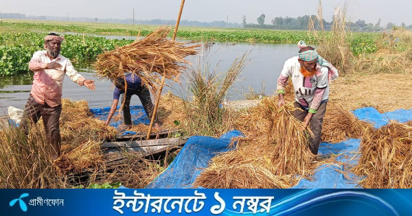 নাটোরের সিংড়া উপজেলার চলনবিলে এখনো নামেনি বন্যার পানি। হেমন্তের অগ্রহায়ণে সারাদেশে নতুন ধান কাটার উৎসব চললেও চলনবিলের কৃষকদের মুখে শঙ্কা আর হতাশা। জমিতে হাঁটু থেকে হাঁটুর ওপরে পানি থাকায় কৃষকদের ধান কাটতে হচ্ছে নৌকা দিয়ে। এতে বাড়ছে শ্রমিক খরচ, কমছে ফলন।