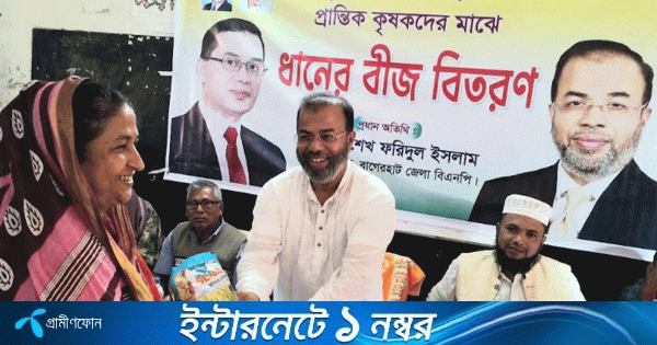 বাগেরহাট-২ আসনে বিএনপির মনোনয়নপ্রত্যাশী লায়ন ড. শেখ ফরিদুল ইসলাম শতাধিক কৃষকের মাঝে উন্নতমানের ধানবীজ বিতরণ করেছেন। শুক্রবার সকালে রামপাল উপজেলার বেতকাটা মাধ্যমিক বিদ্যালয় মিলনায়তনে এ কর্মসূচি অনুষ্ঠিত হয়। শুরুতে বিএনপি চেয়ারপারসন বেগম খালেদা জিয়ার রোগমুক্তি কামনায় দোয়া করা হয়।