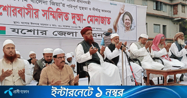 সাবেক প্রধানমন্ত্রী ও বিএনপি চেয়ারপারসন বেগম খালেদা জিয়ার সুস্থতা ও দীর্ঘায়ু কামনা করে যশোরে দোয়া মাহফিল অনুষ্ঠিত হয়েছে।রবিবার (৩০ নভেম্বর) ঈদগাহ মাঠে জেলা বিএনপির আয়োজনে দোয়া মাহফিল অনুষ্ঠিত হয়।