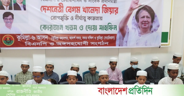 কুমিল্লায় সাবেক প্রধানমন্ত্রী ও বিএনপির চেয়ারপার্সন বেগম খালেদা জিয়ার দ্রুত রোগমুক্তি ও সুস্থতা কামনায় কোরআনখানি, বিভিন্ন মাদ্রাসায় এতিমশিশুদের জন্য খাবার বিতরণ এবং দোয়া মাহফিল অনুষ্ঠিত হয়েছে। বিএনপি’র চেয়ারপার্সনের উপদেষ্টা আমিন উর রশিদ ইয়াছিনের উদ্যোগে এ আয়োজন করা হয়।