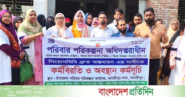 নিয়োগবিধি দ্রুত বাস্তবায়নের দাবিতে মাদারীপুরে কর্মবিরতি ও অবস্থান কর্মসূচি পালন করেছেন পরিবার পরিকল্পনা কর্মীরা। মঙ্গলবার (২ ডিসেম্বর) সকাল থেকে দুপুর পর্যন্ত জেলা পরিবার পরিকল্পনা কার্যালয় প্রাঙ্গণে এ কর্মসূচি অনুষ্ঠিত হয়।
