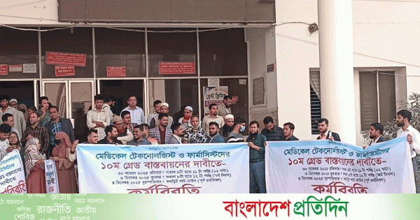 কুমিল্লা মেডিক্যাল কলেজ হাসপাতালের টেকনোলজিস্ট ও ফার্মাসিস্টরা দশম গ্রেডের দাবিতে অর্ধদিবস কর্মবিরতি পালন করেছেন।