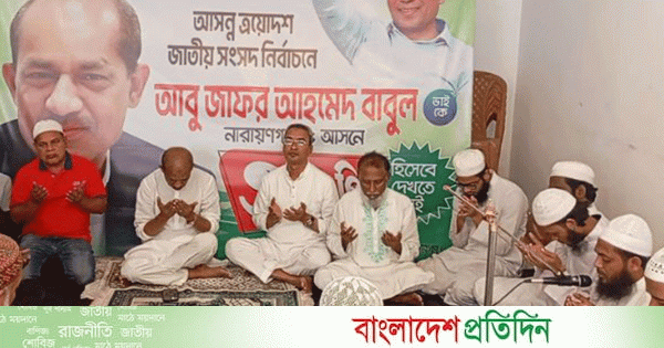 সাবেক প্রধানমন্ত্রী ও বিএনপি চেয়ারপারসন বেগম খালেদা জিয়ার সুস্থতা ও দীর্ঘায়ু কামনা করে নারায়ণগঞ্জে পবিত্র কোরআনে খতম ও দোয়া মাহফিল অনুষ্ঠিত হয়েছে।