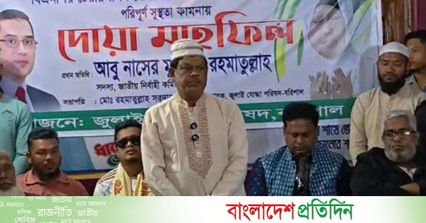 খালেদা জিয়ার পরিপূর্ণ সুস্থতা কামনায় বরিশালে জুলাই যোদ্ধা পরিষদের উদ্যোগে দোয়া মোনাজাত করা হয়েছে। শনিবার নগরীর সদর রোড নিজস্ব কার্যালয়ে দোয়া মোনাজাত অনুষ্ঠান হয়।