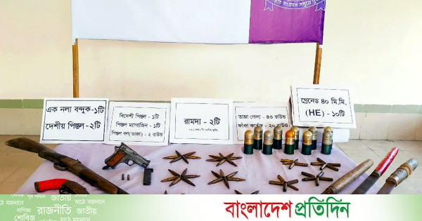 ১টি বিদেশি ও ২টি দেশি পিস্তল, ১টি একনলা বন্দুক, ১০ টি গ্রেনেড, গোলাবারুদসহ দেশী ধারালো অস্ত্র উদ্ধার করা হয়।
