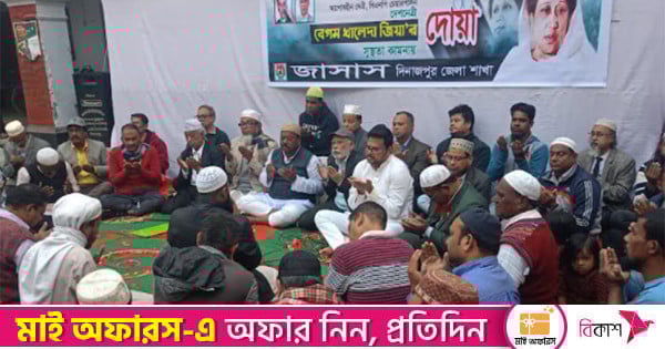 সোমবার বিকেলে জেলা বিএনপির দলীয় কার্যালয়ে বাংলাদেশ জাতীয়তাবাদী সামাজিক-সাংস্কৃতিক সংস্থা (জাসাস)জেলা শাখার আয়োজনে আসন্ন জাতীয় সংসদ নির্বাচনের দিনাজপুর সদর-৩ আসনের ধানের শীষ প্রতীকের এমপি প্রার্থী বিএনপি চেয়ারপার্সন বেগম খালেদা জিয়ার রোগমুক্তি কামনায় দোয়া মাহফিল অনুষ্ঠিত হয়। আলোচনা শেষে দেশনেত্রী বেগম খালেদা জিয়ার রোগ মুক্তি কামনায় দোয়া করা হয়।