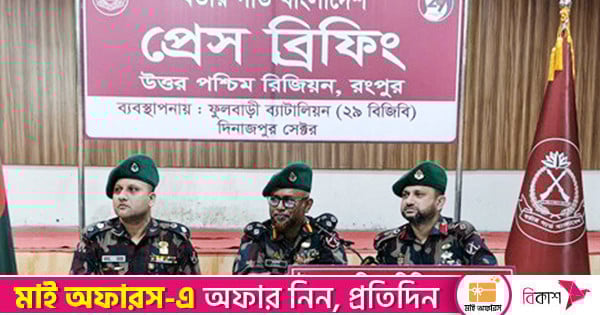 মঙ্গলবার দুপুর ২টায় দিনাজপুর সেক্টরের সদর দপ্তরের অডিটরিয়াম হলে ফুলবাড়ী ব্যাটালিয়ন (২৯ বিজিবি) আয়োজিত প্রেস ব্রিফিংয়ে দিনাজপুর সেক্টরের কমান্ডার কর্নেল মোহাম্মদ ফয়সাল হাসান খান এ তথ্য জানান।