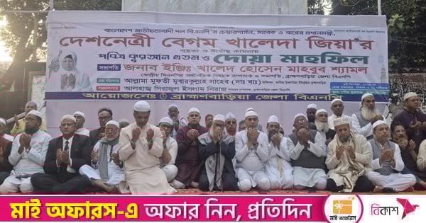 জেলা বিএনপি ও অঙ্গসংগঠনের উদ্যোগে গত মঙ্গলবার বিকেলে স্থানীয় জাতীয় বীর আব্দুল কুদ্দুস মাখন পৌর মুক্ত মঞ্চ ময়দানে আয়োজিত কোরআন খতম ও দোয়া মাহফিলে তিনি এ কথা বলেন। মাহফিলের সভাপতিত্বও করেন ইঞ্জিনিয়ার খালেদ হোসেন মাহবুব শ্যামল।