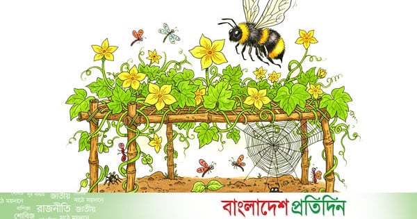 পোকামাকড় ও কীটপতঙ্গদের পদচারণে মুখরিত হয়ে উঠল কুমড়োর মাচা। আট পা ওয়ালা মাকড়সাদের মাচার নিচে জাল বুনে বেশ আরামেই দিনকাল কাটছিল।