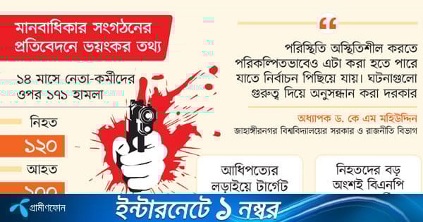 অধিকারের প্রতিবেদন বলছে, ২০২৪ সালের আগস্ট থেকে ২০২৫ সালের সেপ্টেম্বর পর্যন্ত ১৪ মাসে রাজনৈতিক সহিংসতায় নিহত হয়েছেন ২৮১ জন। রাজনৈতিক দলের নেতা-কর্মীদের ওপর দুর্বৃত্তদের দ্বারা কমপক্ষে ১৭১টি হামলার ঘটনা রেকর্ড করা হয়েছে, যাতে কমপক্ষে ১২০ জন মারা গেছেন। আইন ও সালিশ কেন্দ্রের তথ্য বলছে, ২০২৪ সালের আগস্ট থেকে ২০২৫ সালের মে পর্যন্ত ১০ মাসে রাজনৈতিক সহিংসতায় ১২১ জন নিহত হন। এর মধ্যে ৭৪ জন (প্রায় ৬১ শতাংশ) ছিল বিএনপির অভ্যন্তরীণ কোন্দলের শিকার।