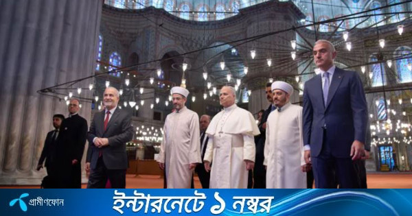 স্থানীয় মুসলিম নেতাদের সঙ্গে পোপ লিও মসজিদের আঙিনা দিয়ে হেঁটে ভেতরে প্রবেশ করেন এবং জুতা খুলে পুরো মসজিদ ঘুরে দেখেন।
