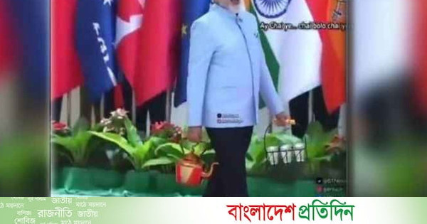 এআই দিয়ে তৈরি ভিডিওতে দেখা যাচ্ছে, মোদির এক হাতে চায়ের কেটলি, আরেক হাতে তিনটি গ্লাস। তার পেছনে থাকা নানা দেশের পতাকার মধ্যে ভারতের পতাকাও দেখা যাচ্ছে। যেন কোনও আন্তর্জাতিক ইভেন্টে চা পরিবেশন করছেন মোদি। তাকে বলতে শোনা যাচ্ছে, ‘চায়ে বোলো, চায়ে।’