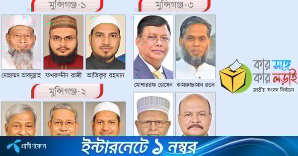 মুন্সিগঞ্জ-১ : শ্রীনগর ও সিরাজদিখান উপজেলার সমন্বয়ে গঠিত মুন্সিগঞ্জ-১ আসন। এ আসনে বিএনপির মনোনয়ন পেয়েছেন সিরাজদিখান উপজেলা বিএনপির সভাপতি শেখ মোহাম্মদ আবদুল্লাহ। অন্যদিকে জামায়াতে ইসলামীর প্রার্থী মুন্সিগঞ্জ জেলা জামায়াতের সেক্রেটারি এ কে এম ফখরুদ্দীন রাজী। জাতীয় নাগরিক পার্টি থেকে এ আসনে মনোনয়ন কিনেছেন তিনজন। ইসলামী আন্দোলনের প্রার্থী কে এম আতিকুর রহমান। সব প্রার্থীই সমানতালে ভোটের মাঠ চষে বেড়াচ্ছেন।