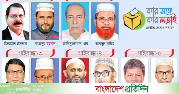 গাইবান্ধা-৪ (গোবিন্দগঞ্জ) : এ আসনে ১২টি জাতীয় নির্বাচনে আওয়ামী লীগ প্রার্থী চারবার, জাপা তিনবার, বিএনপি তিনবার ও স্বতন্ত্র প্রার্থী দুবার বিজয়ী হন। বিএনপির প্রয়াত সংসদ সদস্য আবদুল মোত্তালিব আকন্দের ছেলে মোহাম্মদ শামীম কায়ছার লিংকনকে এ আসনে দলীয় প্রার্থী মনোনীত করা হয়েছে। তিনি উপজেলা বিএনপির আহ্বায়ক কমিটির সদস্য। বাবার মৃত্যুর পর উপনির্বাচনে তিনি সংসদ সদস্য নির্বাচিত হয়েছিলেন। এ আসনে জামায়াতের প্রার্থী জেলা জামায়াতের সাবেক আমির ও কেন্দ্রীয় মজলিসের শুরা সদস্য মো. আবদুর রহিম। তিনি চিকিৎসক হওয়ার সুবাদে এলাকায় বেশ সুপরিচিতি।