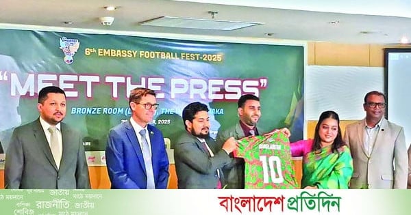 আসন্ন ফিফা বিশ্বকাপের আগে ঢাকায় যেন আরেক মিনি ফুটবল বিশ্বকাপ। আগামীকাল বসুন্ধরার ইন্টারন্যাশনাল স্কুল অব ঢাকায় শুরু হচ্ছে ষষ্ঠ এম্বাসি ফুটবল ফেস্ট। দুই দিনব্যাপী এ প্রতিযোগিতায় ২৪টি দেশের দূতাবাস ও আন্তর্জাতিক সংস্থা অংশগ্রহণ করবে। গতকাল বিকালে রাজধানীর হোটেল ওয়েস্টিনে এক সংবাদ সম্মেলনে এ তথ্য জানিয়েছে বাংলাদেশ পররাষ্ট্র মন্ত্রণালয় ও গেম প্লে। এ সময় টুর্নামেন্টের জার্সি ও চ্যাম্পিয়নশিপ ট্রফি উন্মোচন করা হয়। সংবাদ সম্মেলনে উপস্থিত ছিলেন পররাষ্ট্র মন্ত্রণালয়ের ডেপুটি চিফ অব প্রটোকল আরিফ মোহাম্মদ, কানাডার হাইকমিশনার অজিত সিং, রয়েল নরওয়েজিয়ান এম্বাসেডর হাকন অ্যারাল্ড গুলব্রান্ডসন, সৌদি আরবের ডেপুটি এম্বাসাডর ইব্রাহিম আলাহমারি, সৌদিয়া বাংলাদেশের ম্যানেজার সালমান এ আলালি ও ছুটি অরণ্যবাস ও ছুটি ফরেস্ট ইগলের ব্যবস্থাপনা পরিচালক শামসুল ইসলাম মাসুদ প্রমুখ। বসুন্ধরা আবাসিক এলাকায় ইন্টারন্যাশনাল স্কুল ঢাকা (আইএসডি) মাঠে শুক্রবার সকাল ৯টায় টুর্নামেন্টের উদ্বোধন করা হবে। শনিবার বিকালে টুর্নামেন্টের সমাপনী ও পুরস্কার বিতরণী অনুষ্ঠানের মধ্য দিয়ে পর্দা নামবে এবারের এম্বাসি ফুটবল ফেস্টের।