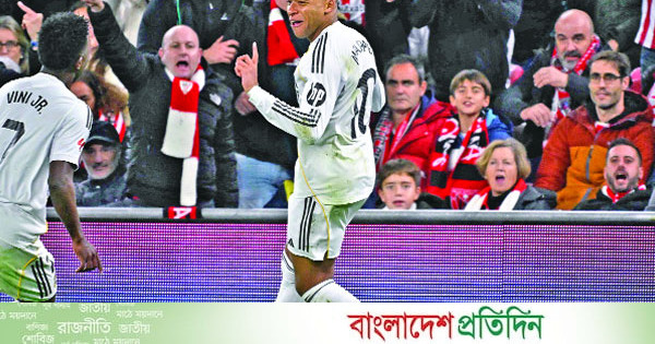 স্প্যানিশ লিগায় টানা তিন ম্যাচে হোঁচট রিয়াল মাদ্রিদের। এতে চিরপ্রতিদ্বন্দ্বী বার্সেলোনোর কাছে শীর্ষস্থান ধরে রাখার লড়াইয়ে হার মানতে হয়েছে কিলিয়ান এমবাপ্পে, ভিনিসাস জুনিয়রদের। এটা অনেকটা আকাশ ভেঙে পড়ার মতোই অবস্থা লস ব্লাঙ্কোসদের। এমন সময় আবার এমবাপ্পে ম্যাজিক। এ ফরাসি তারকার জোড়া গোলে ভর করে ফাঁড়া কাটাল জাবি আলোন্সির দল। লা লিগায় টানা তিন ম্যাচে হোঁচটের পর জয়ের ধারায় ফিরেছে রিয়াল মাদ্রিদ। অ্যাথলেটিকো বিলবাওয়ের বিপক্ষে ৩-০ গোলে জিতে বার্সেলোনার (৩৭) সঙ্গে পয়েন্ট ব্যবধান কমাল কিলিয়ান এমবাপ্পেরা (৩৬)। এ ম্যাচে জোড়া গোল করেন রিয়াল তারকা কিলিয়ান এমবাপ্পে। আরেকটি গোল করে তাকে সঙ্গ দিয়েছেন এদুয়ার্দো কামাভিঙ্গা। ম্যাচের সপ্তম মিনিটেই গোল করেন ফরাসি তারকা। ৪২ মিনিটে রিয়ালের হয়ে ব্যবধান দ্বিগুণ করেন কামাভিঙ্গা। এ গোলেও সহায়তা করেন এমবাপ্পে। বিরতির পর ৫৯ মিনিটে জয়ের ব্যবধান ৩-০ করেন এমবাপ্পে। চলতি লিগে এটি তার ১৬তম গোল। লা লিগায় তো বটেই, ইউরোপের শীর্ষ পাঁচ লিগের মধ্যেই যা সর্বোচ্চ। ১৫ গোল নিয়ে দুইয়ে আর্লিং হল্যান্ড। আর সবমিলিয়ে এমবাপ্পে এ মৌসুমে ২৫ গোল করে আছেন শীর্ষে। দ্বিতীয় সর্বোচ্চ ২৪ গোল করেছেন বায়ার্ন মিউনিখের হ্যারি কেইন।