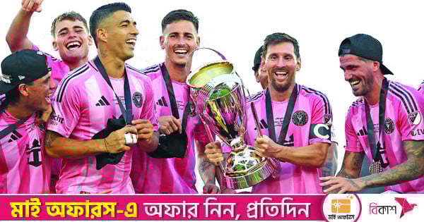 লিওনেল মেসি ইন্টার মায়ামিতে যোগ দেওয়ার পরই আমেরিকায় ফুটবলের জনপ্রিয়তা বহু গুণ বেড়ে গিয়েছিল। দিনে দিনে এ জনপ্রিয়তা কেবল বেড়েই চলেছে। আর্জেন্টাইন তারকা একের পর এক ম্যাচে অবিশ্বাস্য পারফরম্যান্স করে ভক্তের সংখ্যা বাড়িয়েই চলেছেন। ২০২৩ সালে ইন্টার মায়ামিতে যোগ দিয়েই জয় করেছিলেন লিগস কাপের ট্রফি। গত বছর জয় করেন সাপোর্টার্স শিল্ড। এবার জয় করলেন মেজর লিগ সকারের সবচেয়ে বড় ট্রফি, এমএলএস কাপ। উত্তর আমেরিকায় এটাই সবচেয়ে বড় ট্রফি। মেজর লিগ সকারের দুটি কনফারেন্সের সেরা দলগুলোকে নিয়ে অনুষ্ঠিত হয় এ টুর্নামেন্ট। লিওনেল মেসির ইন্টার মায়ামি গতকাল এ টুর্নামেন্টের ফাইনালে ৩-১ গোলে পরাজিত করেছে কানাডার ক্লাব ভ্যানকুভারকে। ম্যাচের ৮ মিনিটে ভ্যানকুভারের ওক্যাম্পো আত্মঘাতী গোল করে ইন্টার মায়ামিকে এগিয়ে দেন। এরপর রদ্রিগো ডি পল ৭১ মিনিটে এবং ট্যাডেও অ্যালেনডে অতিরিক্ত সময়ে একটি করে গোল করে দলের ৩-১ ব্যবধানের জয় নিশ্চিত করেন। দুটি গোলেই এসিস্ট করেন লিওনেল মেসি। এর আগে কনফারেন্স ফাইনালে নিউইয়র্ক এফসিকে হারিয়েছে ইন্টার মায়ামি। নিজেদের ইতিহাসে প্রথমবারের মতো মেজর লিগ সকার কাপ জয় করল দলটা। লিওনেল মেসি এবারের মৌসুমে দলগত ট্রফি ছাড়াও জয় করেছেন এমএলএস গোল্ডেন বুট। আর্জেন্টাইন তারকার ক্যারিয়ারে এটি ৪৮ নম্বর ট্রফি। তিনি বার্সেলোনার জার্সিতে ৩৫টি, পিএসজির জার্সিতে তিনটি, আর্জেন্টিনার জার্সিতে চারটি, ইন্টার মায়ামির জার্সিতে তিনটি, আর্জেন্টিনা অনূর্ধ্ব-২০ দলের হয়ে একটি এবং অনূর্ধ্ব-২৩ দলের হয়ে একটিসহ মোট ৪৭টি ট্রফি জয় করেন। এ তালিকায় লিওনেল মেসিই সবার ওপরে। ইন্টার মায়ামিতে তিন মৌসুমে তিন ট্রফি জয় করলেন মেসি। অন্যদিকে তার প্রতিদ্বন্দ্বী ফুটবলার ক্রিস্টিয়ানো রোনালদো সৌদি আরবে চার বছরে আল নাসরের হয়ে জয় করেছেন একটি ট্রফি। এমএলএস কাপ জয়ের পর লিওনেল মেসি বলেছেন, ‘আমাদের প্রধান লক্ষ্য ছিল এই ট্রফি জয় করা। আমরা সেটি করতে পেরেছি। এটি আমাদের জন্য যেমন আবেগের তেমনি সুন্দরের প্রতীক হয়ে থাকবে।’