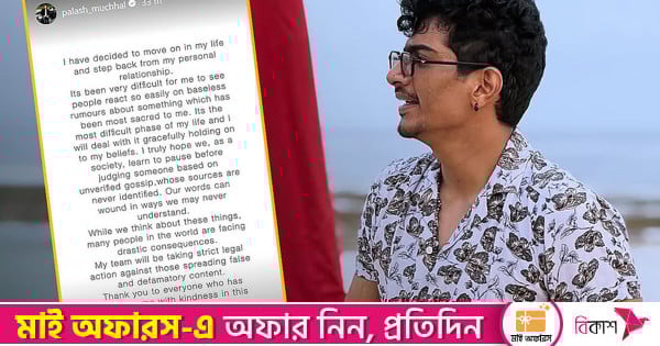 পলাশ ইনস্টাগ্রামে লিখেছেন, ‘আমি জীবনে মুভ অন করার সিদ্ধান্ত নিয়েছি এবং ব্যক্তিগত সম্পর্ক থেকে পিছিয়ে যাচ্ছি।’